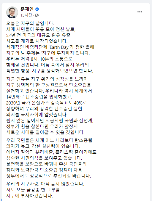 또한 문재인 대통령은 이날 사회관계망 서비스(SNS) 페이스북을 통해 "세계적인 비영리단체 '얼스 데이(Earth Day)'가 정한 올해 지구의 날 주제는 '지구에 투자하자'다"라며 "우리는 저녁 8시, 10분의 소등으로 함께할 것이다"라고 전했습니다.